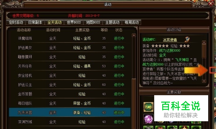 《烈火战神》是一大型即时角色扮演型网页游戏,游戏实现了以网页构架形式展现海量用户同场景的游戏互动;相比目前上市的其他ARPG类游戏在游戏玩法上独树一帜,采用丰富活动玩法和经典剧情副本相结合的模式,《烈火战神》游戏画面力求营造出逼真写实的场景视觉效果,写实优美的魔幻世界和流畅的画面给玩家带来不一样的游戏体验。下面为大家简单介绍一下,如何去玩《烈火战神》九天冰宫。