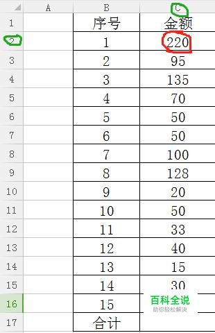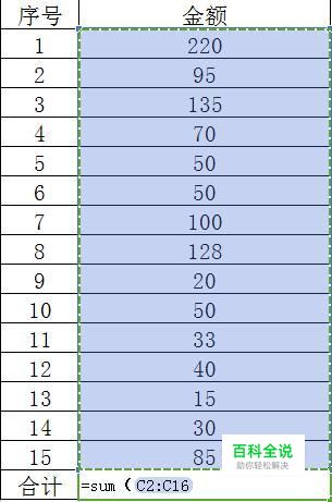 如果你不选择拖拉的方法的话,也可以在求和的单元格里面输入第一列的坐标加冒号(:)+最后一列的坐标。如小编我的第一列坐标是C2,最后一列坐标是C16,此时我可以在单元格输入C2:C16。