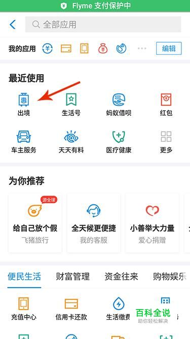 进入全部应用界面,我们在“购物娱乐”中点击“出境”进入相关服务。