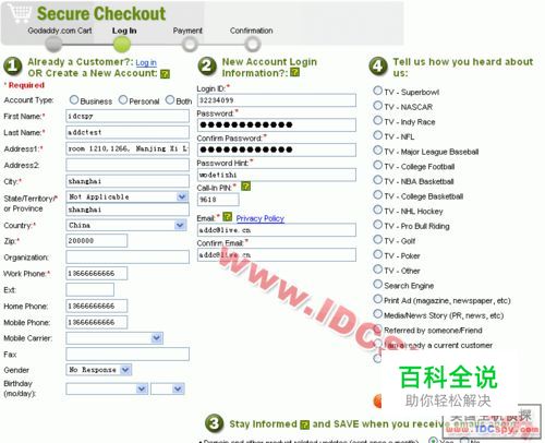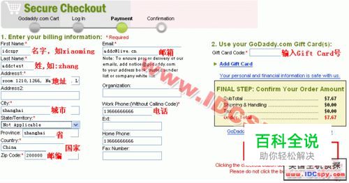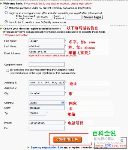 如果你在GoDaddy没有帐号,选择“I would like to create a newGoDaddy.com account”创建一个新的用户,然后根据图中的翻译填写域名信息,点击Continue继续