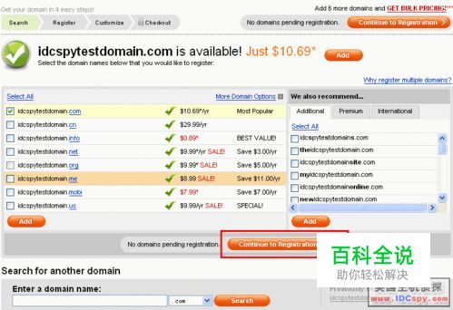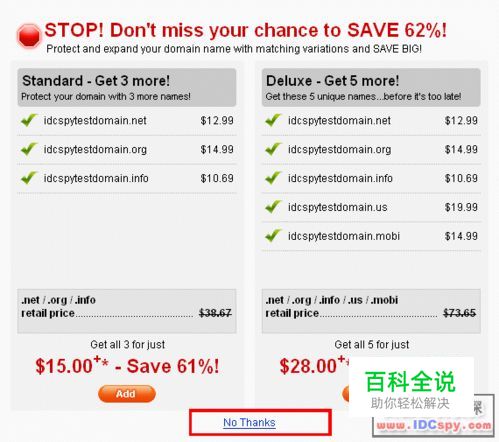 如果出现下图推荐你同时注册net,org,info等域名获得优惠的,一般不用注册。直接点No,Thanks