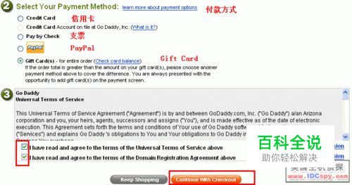 下面输入的信息为GoDaddy账户信息。点击“continue with check out”继续下一步。