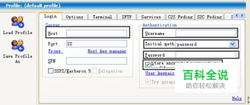 在 Login界面,输入您的账号信息,其中Host为服务器地址,Username为用户名,Initial meth 请选择 password,然后后面会出来输入框,填写你的ssh密码。同时选中 store XXX这一行。保存账号密码.(为防止输入错误,可以直接复制账号密码,注意账号和密码前后都不要有空格),如图: