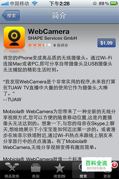 这个软件叫WebCamera,远离时通过wifi网络将iPhone上的视频实时发到电脑上实现摄像头功能,在App Store上这个软件售价是1.99美元。