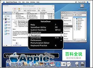 Mac OS X 10.4 [tiger] 具备 VoiceOver 功能,这是专为视力受损或有学习障碍的人所提供的英文语音介面,也是与 Mac 互动的全新方式。启用 VoiceOver 时,它会读出网页、电子邮件及文字档的内容。它还可以让您听到萤幕工作空间中所有项目的描述,并说明电脑上发生哪些活动.