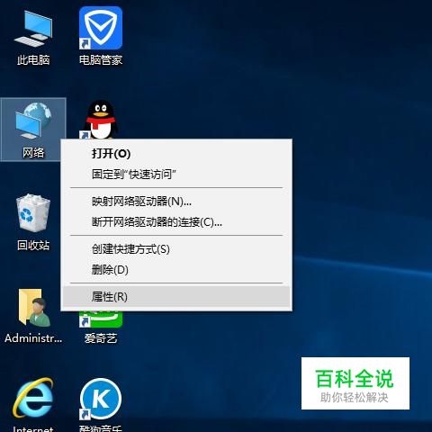 右键单击桌面的“网络”图标,在弹出的菜单里点“属性”。