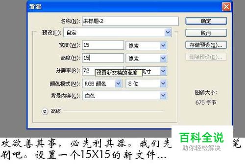 工欲善其事,必先利其器。我们先做个简单的笔刷,新建一个15 * 15像素的文档,如下图。