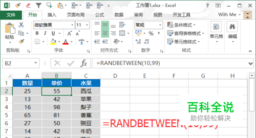 启动Excel2013之后,在表格中,在A1单元格输入“ 数量”,B1输入“ 单价”,C1输入“ 水果”,在输入数量和单价的时候,采用随机函数,快速填充数据。在A2和B2输入公式并向下填充。