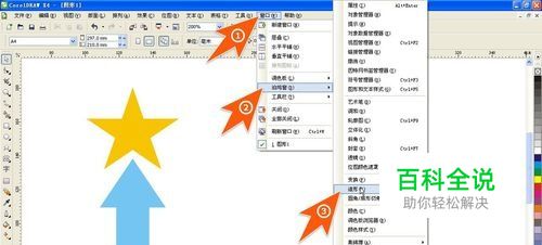 在这个CDR合并焊接图形对象的示范中,要将下图中的五角星和箭头形状合并成一个图形,先点击上方菜单栏里的窗口项,再点泊坞窗,然后点击造形。