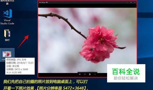 我们先把自己拍摄的照片放到电脑桌面上,可以打开看一下照片效果,【照片分辨率是5472×3648】,但我们的桌面壁纸分辨率是1920×1080,因此需要我们自己修改一下照片尺寸