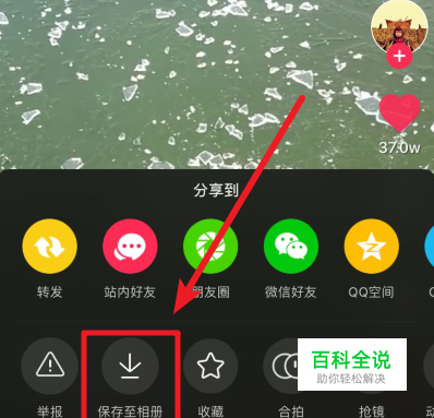 点击后,在下方的弹出窗口中,我们点击保存至相册的选项,将视频保存到手机。