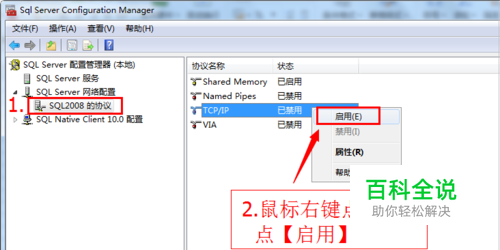 启用TCP/IP协议: 1、打开SQL配置管理器; 2、启用TCP/IP服务; 3、打开端口(默认1433)