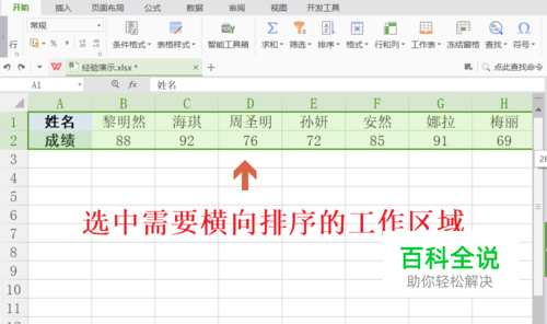 选中工作区域的单元格范围。 通过Ctrl+A或者鼠标框选,选中需要啊实现横向排序的工作区域的单元格范围。