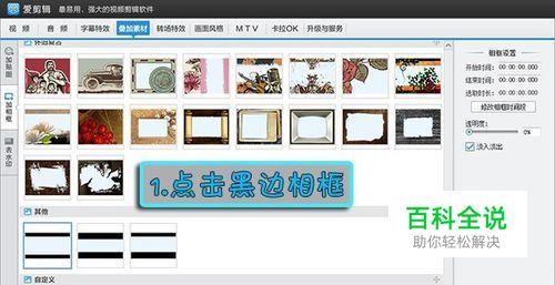 切换到“叠加素材”——“加相框”列表,点击“其他”栏中的黑边相框,然后点击“添加相框效果”就可以使用啦~