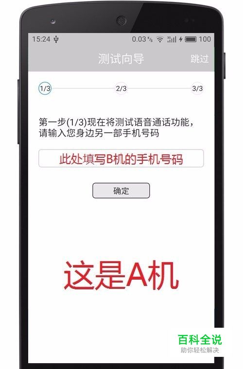在A机上运行挂机宝APP,开始测试向导,并输入B机的手机号