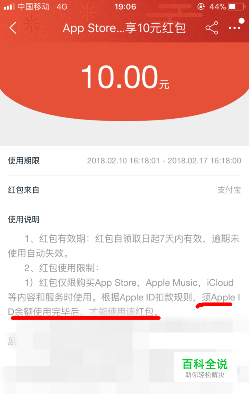 我们可以在淘宝卡券包里找找,但是红包来源上面写的是支付宝。 此外还有一条,说 “Apple ID余额使用完后才能使用该红包”。 所以建议还是用光余额再充值吧。