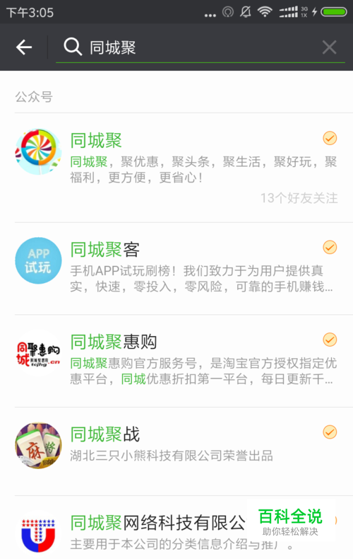 打开微信,点击顶部搜索 → 点击公众号 → 输入“ 同城聚 ” → 点击搜索按钮,一般是第一个,如图: