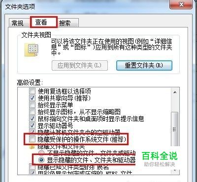 切换到【查看】选项卡,在【高级设置】列表中去掉【隐藏受保护的操作系统文件】,并选择【显示隐藏的文件、文件夹和驱动器】,然后单击【确定】按钮保存设置