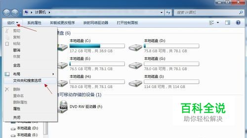 首先我们要开启显示隐藏受保护的系统文件和文件夹的设置。打开计算机,单击【组织】菜单中的【文件夹和搜索选项】命令
