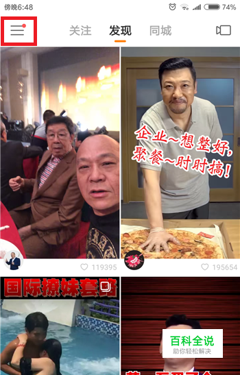 进入到快手中后,在推荐界面中找到左上角的【三】按钮打开快手个人中心。