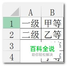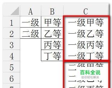 首先,看一下原始数据。A1和A2是两个主等级,B1:B4是四个附属等级,每个主等级都有四个附属等级。需要在C列显示出所有的组合情况。
