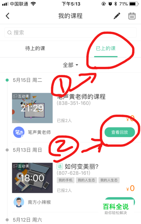 在我的课程中,点击‘已上的课’,寻找相应的课程,点击‘查看回放’按钮即可查看课程回放。