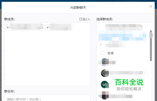 可以直接在左侧输入搜索要加到内部群里面的人员,也可以在右侧按部门找到人员后点击勾选。