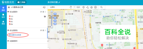 还可以通过批量上传位置数据进行多点标注 点击“批量添加数据”工具,弹出添加数据对话框,有2种方式添加数据:本地上传和API上传。如下图所示: