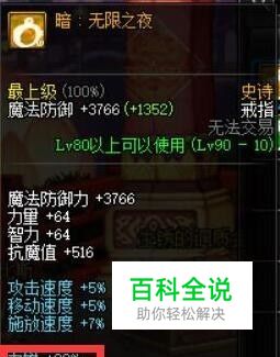 戒指: 暗:无限之夜 攻速+5%; 移速+5%; 释放速度+7%; 力量智力+20%; 属性很强,直接增加20%的智力和力量,不论是百分比还是固伤都有很大的提高。