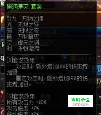 黑洞湮灭,套装属性如下图:有三件套和五件套两个套装属性。