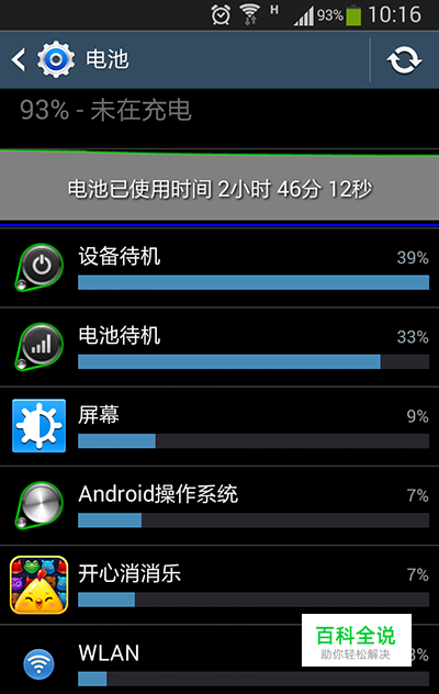 每个智能手机用户使用手机方式不尽相同, 所以享要省电, 就得先了解本身手机使用方式, 进而对症下药从中找出省电之道. 1. 查看手机电池使用状况: 手机-设置-电池,就能看到电池使用情况,及具体的应用程序使用电量情况;知道真正耗电元凶,就关闭或者删掉。(如图,这是使用应用管家软件后的电池使用量)