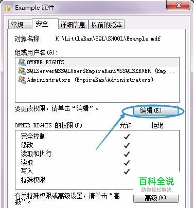在附加文件目录下找到.mdf文件,点击右键,查看“属性”,选择“安全”选项卡 点击“编辑”编辑按钮