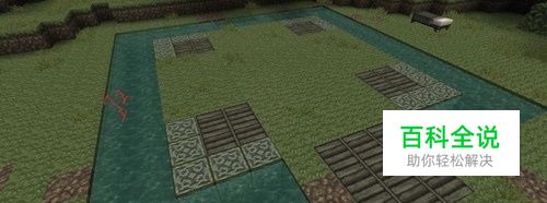 在泥土上修建栅栏后将泥土去除并在原泥土和桥下填充为水完成护城河的修建。在箭头所指处挖去泥土并修建石砖台阶。