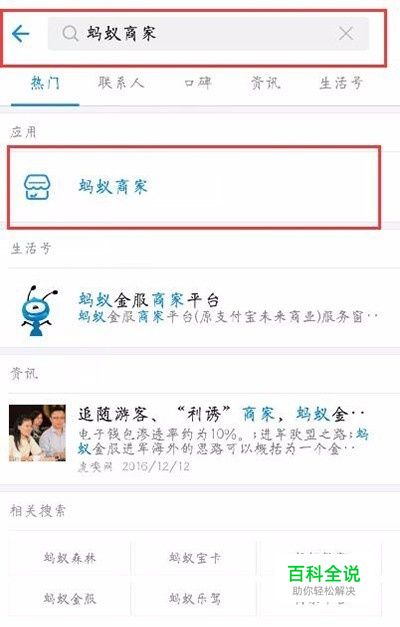 1、首先登陆支付宝,然后搜索蚂蚁商家,点击进入;