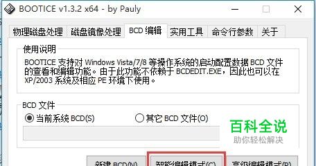 下载BOOTICE,本软件分32位和64位,请根据系统选择正确的版本。 运行BOOTICE,切换到“BCD编辑”页,点“智能编辑模式”