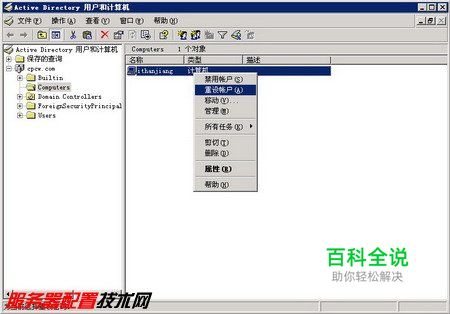 解决方法:首先需要重新设置域成员计算机账户。以域管理员身份登录域控制器,打开“Active Directory用户和计算机”窗口。右键单击域成员计算机账户名称,然后执行“重设账户”快捷命令,如图2008120508所示。