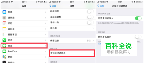 在手机“设置—信息—未知与过滤信息”中开启“腾讯手机管家”。