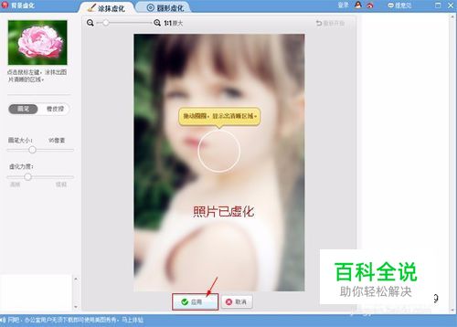 进入到背景虚化编辑界面里,你会看到照片已经自动变成了模糊的效果了,这个时候什么都不要按,只要点击“应用”就可以了。