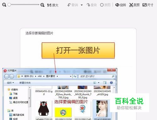 在美化图片的界面中,在点击中间的“打开一张图片”按钮,在弹出来的电脑目录窗口中选择一张要编辑制作的照片,接着点击“打开”。