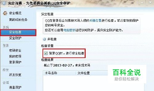 在安全页面,点击“安全检查”,然后把“登录QQ时,进行安全检查”前面的勾选去掉即可。这时登录QQ时,就可以有效地减少自动扫描时占用的系统资源,对QQ进行优化加速。