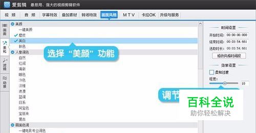 为视频快速美颜 接下来我们就可以开始为视频快速美颜,在“画面风格”面板的“美化”栏中,含有“一键美颜”、“美白”、“磨皮”等多种人物美颜功能,只需选中该功能效果并点击“添加风格效果”按钮,即可马上使用,然后对“效果设置”中的“程度”进行调节,直到把视频中的人像调至你最满意为止。(PS:爱剪辑专业先进的磨皮美颜技术,做到只磨皮不磨背景!)