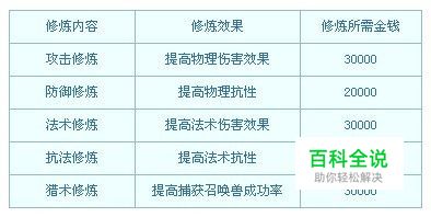 具体修炼效果: 1)每修炼一次,提高10点修炼经验(每个修炼类型都有一个修炼经验) 2)修炼到某等级所需要经验=(修炼等级*修炼等级+修炼等级*3+11)*10 3)按修炼等级的高低,在战斗时额外增加相应效果
