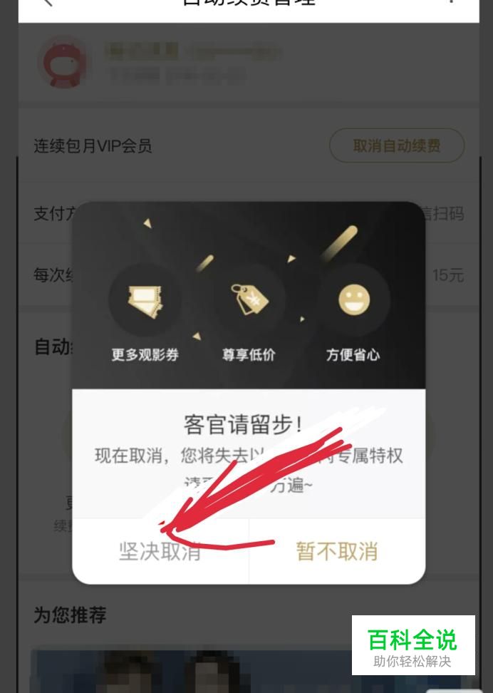 会弹出一个客官请留步的对话框,点击对话框左下角的坚决取消。如图所示。取消后,会弹出一个界面提醒你自动续费取消成功。