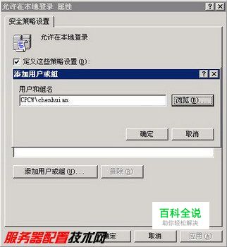第2步,在打开的“允许在本地登录 属性”对话框中单击“添加用户和组”按钮,并单击“浏览”按钮找到目标用户,连续单击“确定”按钮完成添加,如图2008120523所示。 图2008120523 添加允许在本地登录的用户或组