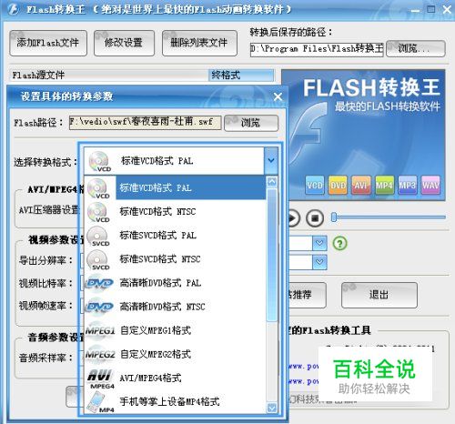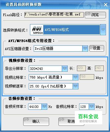 设置导出格式参数 选择导出格式后,我们可以对导出分辨率、比特率进行设置,Flash转换王支持导出AVI、VCD、SVCD、DVD、MPEG1、MPEG2、MP4等众多应用广泛的格式,参数设置也非常灵活,如果我们最终导出格式是GIF,那可以使用软件默认参数,效果已经非常不错。下图以AVI为例: