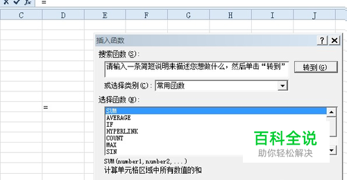 这时公式开始的“=”出现在单元格和编辑栏上,然后在打开的“插入函数”对话框中的“选择函数”列表下找到“SUM”函数。说明:如果你需要的函数不在里面,可以打开“或选择类别”下拉列表进行选择。