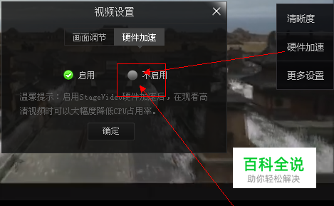 如果是网页看看,可以使用下面的两种方法:通过网页播放器上面的“设置”按钮,打开“硬件加速”选项卡,选择“不启用”。