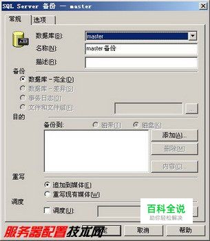 第3步,打开“SQL Server 备份”对话框,然后单击“数据库”右侧的下拉三角,从中选择要备份的数据库名称(本例采用默认的Master数据库)。在“名称”编辑框中可以键入备份生成的文件名称。接着单击“添加”按钮,如图2008120219所示。 图2008120219 “SQL Server 备份”对话框