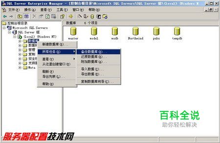 第2步,在企业管理器控制台窗口的左窗格中依次展开“Microsoft SQL Servers/SQL Server组/local”目录树。然后用鼠标右键单击“数据库”选项,在弹出的快捷菜单中执行“所有任务”→“备份数据库”命令,如图2008120218所示。 图2008120218 执行“备份数据库”命令