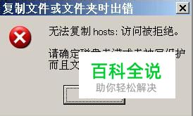 如上图,打开上图的路径,就会找到相关的文件,里面有一个文件,名称就是Hosts,可以到网上下载一个未感染病毒的文件,将其覆盖,问题就解决了! 或者,使用覆盖的办法,问题不一定能解决,就像俺的,想覆盖还不成呢,出现如下图的错误: